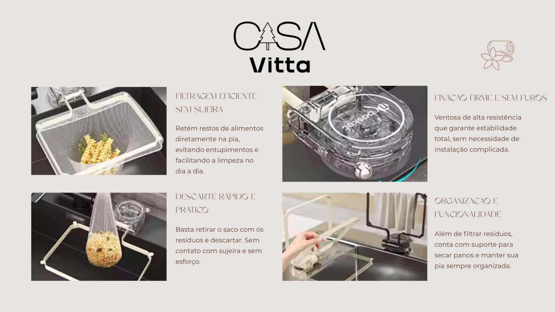 O sistema utiliza um suporte com ventosa que se fixa facilmente na pia, acompanhado de redes filtrantes descartáveis.